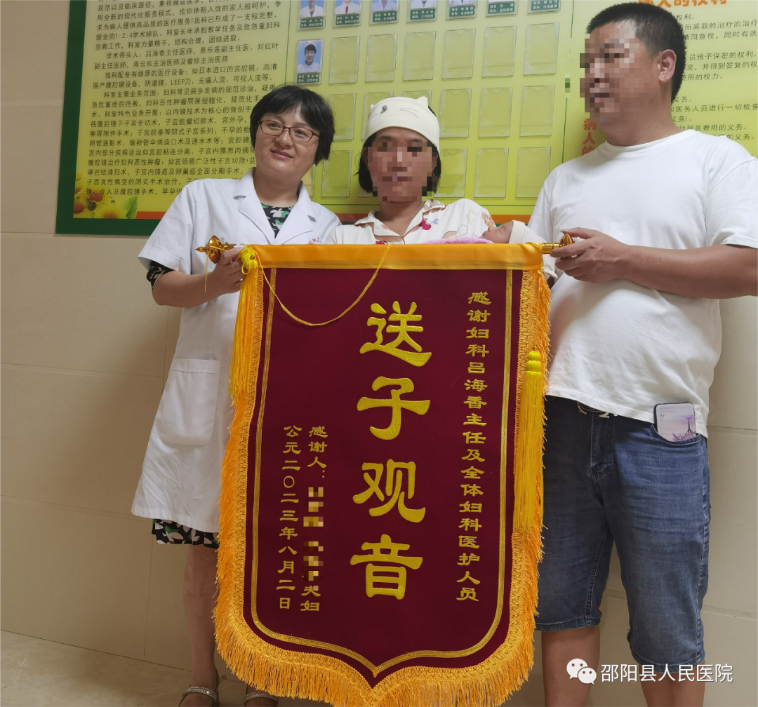 李女士早年在生育孩子后进行了输卵管结扎手术,二胎政策开放后,一直寻求再孕 ,2022年来我院妇科求医。妇科主任吕海香为其进行了“双侧输卵管吻合术+子宫输卵管通液术+盆腔粘连松解术”。经过术后的调理与备孕指导,李女士成功怀孕并顺利生产。李女士与丈夫特意携带宝宝来院送上“送子观音”的锦旗以表感谢。