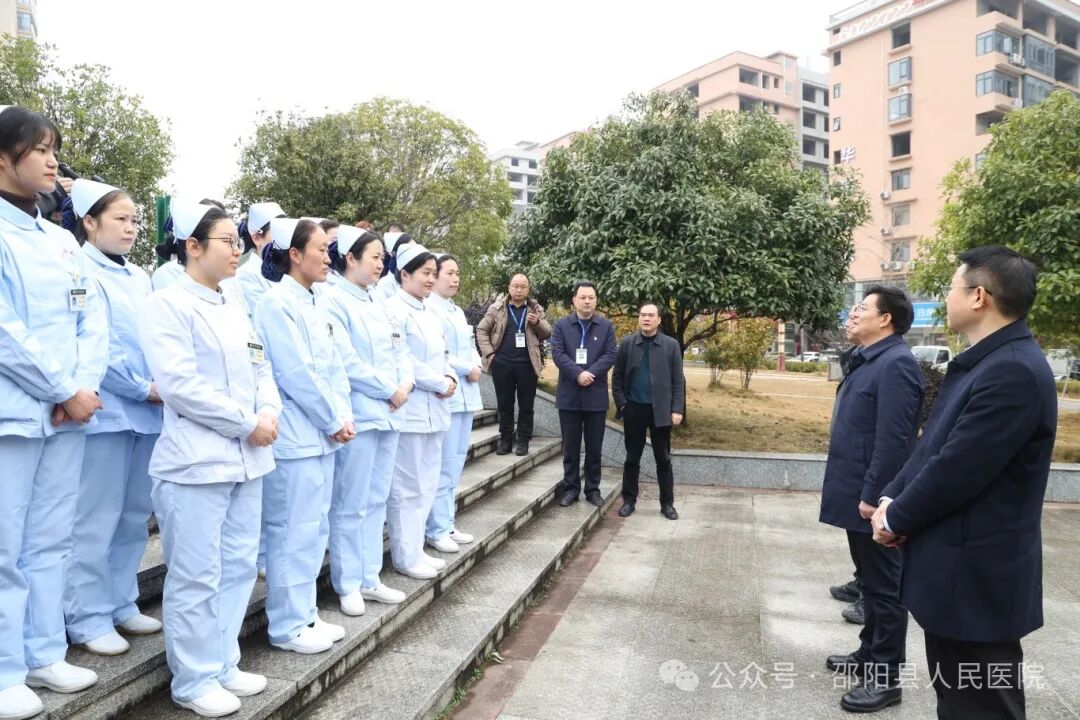 又是一年新春至,最是情暖岁寒时。2月8日上午,在新春来临之际,邵阳县县委书记袁胜良,县委常委、县政法委书记曾林,县委常委、县委办主任李卫军看望慰问了我院一线医务人员,向春节期间仍坚守在临床一线的医务人员送上党和政府的亲切关怀,并向所有医务人员及家属致以亲切的问候。县卫健局局长袁杰勇、副局长刘海峰陪同参与慰问活动。