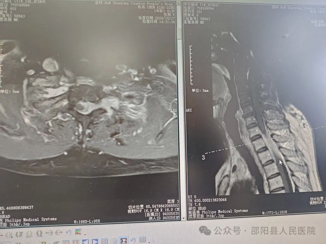 51岁的陈女士10个月前无明显诱因出现腰背疼痛并双下肢乏力麻木,近1月来双下肢乏力加重并逐渐出现双手精细动作不协调,腹部及腰骶部束缚感,需拄拐行走。以“双下肢乏力待查,颈胸椎肿瘤”收住骨一科治疗。入院后经完善相关检查后,发现陈女士颈7-胸2椎管内巨大肿瘤占据椎管并突破椎管进入胸腔,呈哑铃状改变,椎管骨性结构部分破坏。