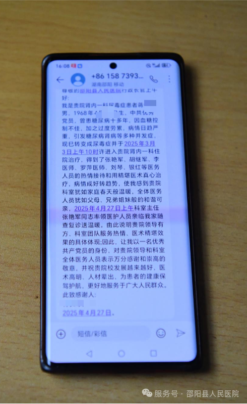 4月27日,医院行政总值班的手机收到一条短信,值班人员点开一看,一段长长的文字映入眼帘,言词中充满了感激之情。这条短信来自56岁的共产党员蒋建国(化名),一位与糖尿病肾病抗争五年的患者。信中写道:“在我最无助的时刻,肾内科的医护人员让我感受到了家的温暖。在这里,我不仅仅是一个病人,更是一个被尊重和关怀的人。”