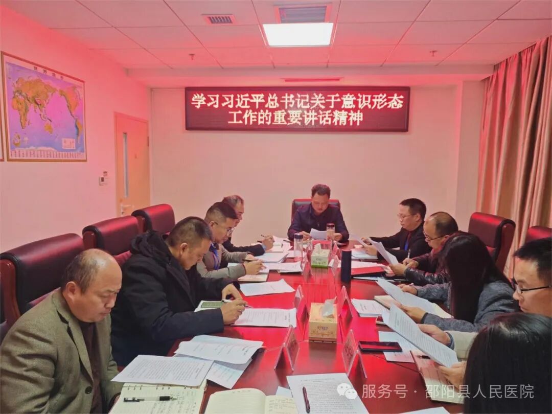 12 月 10 日,邵阳县人民医院党委积极开展“第一议题”学习活动,深入学习习近平总书记关于意识形态工作的重要论述。此次学习对于医院在新时代背景下,坚守思想阵地、凝聚发展力量具有极为重要的意义。党委书记唐德军主持会议,党委班子成员出席会议。